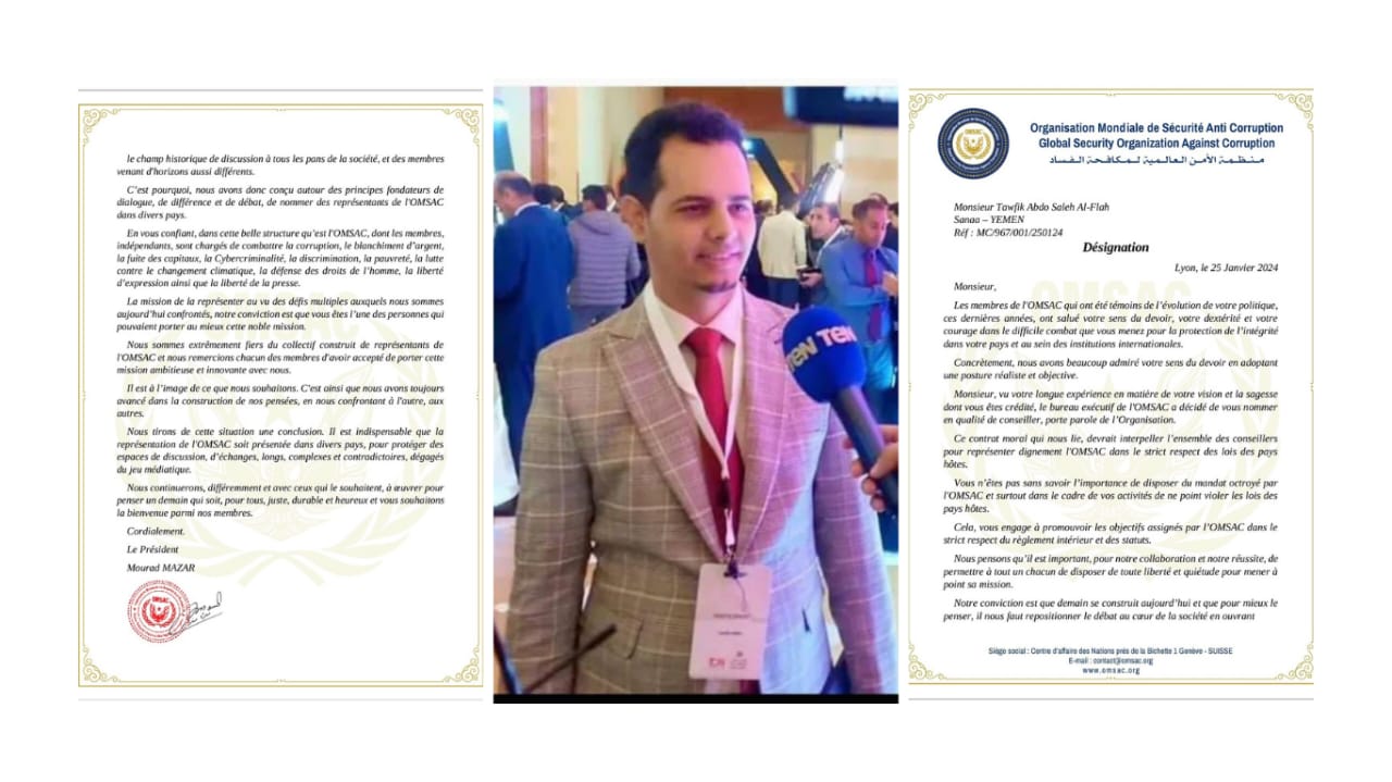 أصدر الدكتور مراد مزار، رئيس منظمة الأمن العالمي لمكافحة الفساد، قرار بتعيين الدكتور توفيق عبده صالح الفلاح، الناطق الرسمي لمنظمة الأمن العالمي لمكافحة الفساد ومقرها جنيف ومسجلة في الأمم المتحدة. توفيق الفلاح