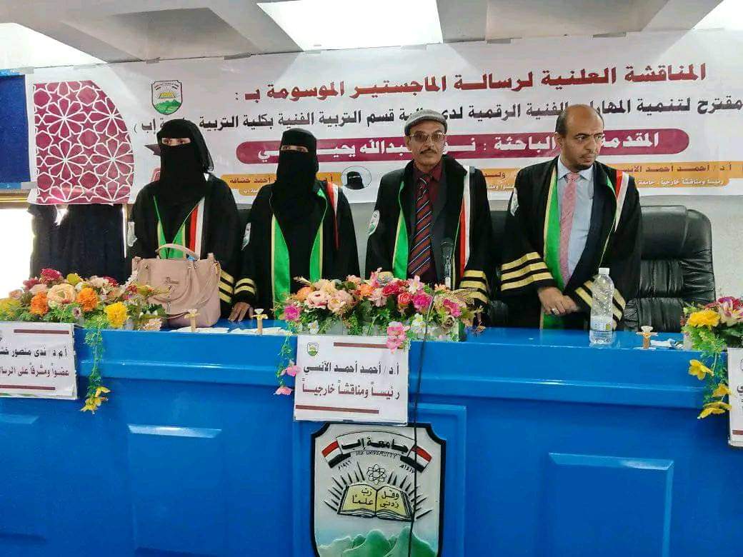 الاثنين، 16 شعبان1444هـ الموافق26 فبراير2024حصلت الباحثة نوال عبدالله يحى الضيعه على درجة الماجستير بامتياز من جامعة إب في الإدارة التخطيط التربوي عن رسالتها الموسومة بـ" برنامج تدريبي مقترح لتنمية المهارات الفنية