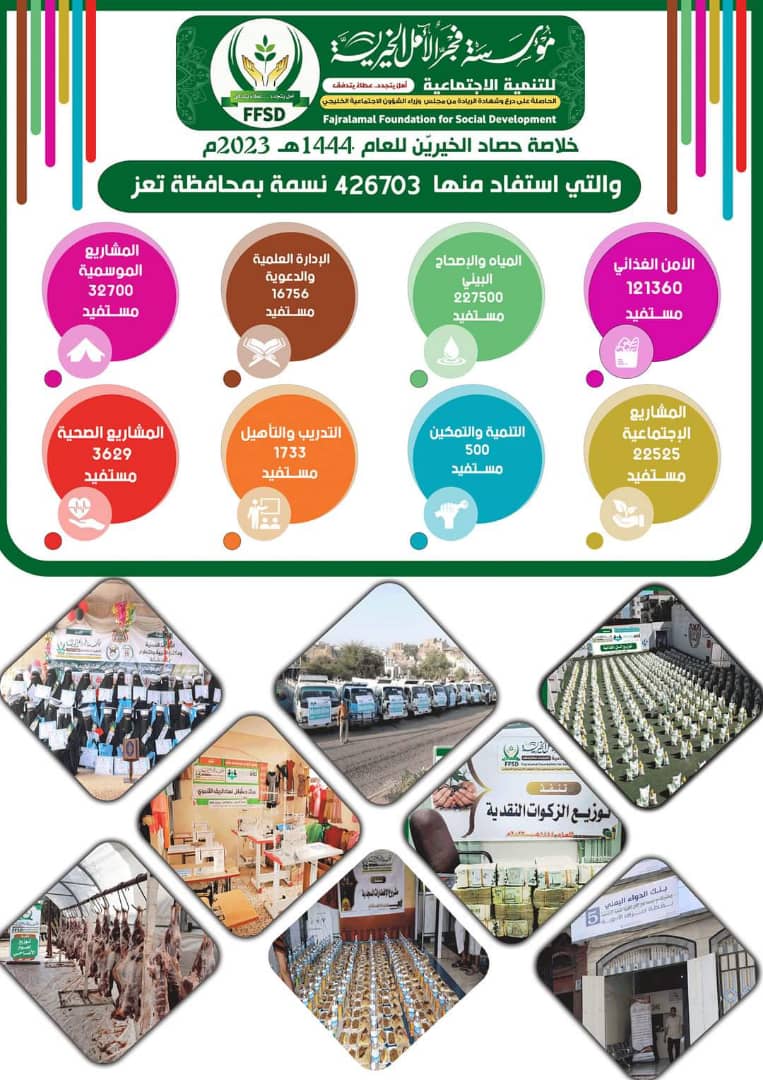 نشرت مؤسسة فجر الأمل الخيرية للتنمية الأجتماعية تقريرها السنوي للعام المنصرم والذي وصل عدد المستفيدين إلى اربعمائة وستة وعشرون الف وسبعمائة وثلاثة نسمة من مشاريعها التي تنوعت حسب المجالات والمشاريع الآتيةمشروع