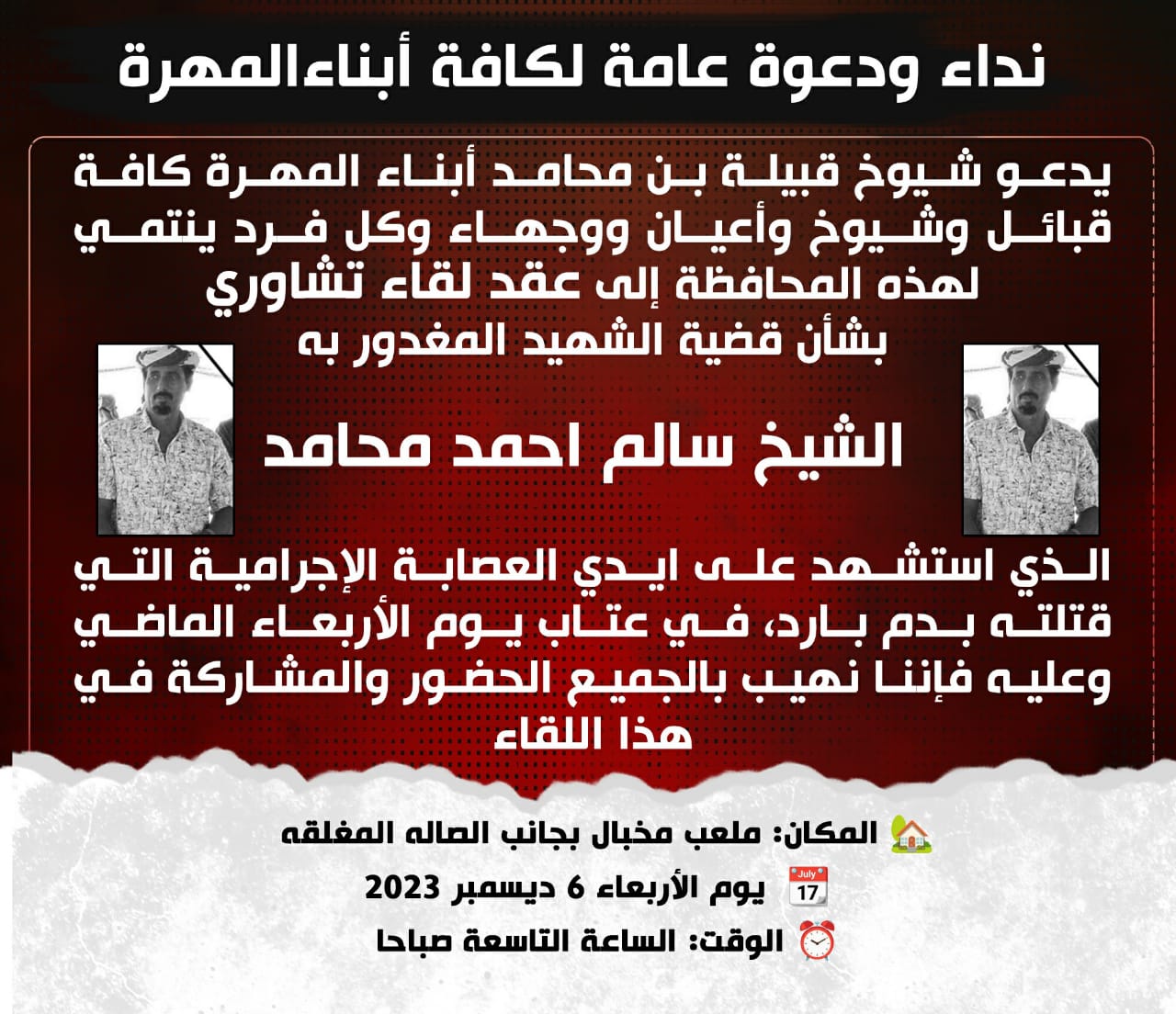 المهرة /خاصدعا شيوخ قبيلة بن محامد أبناء المهرة كافة قبائل وشيوخ واعيان ووجها وكل فرد ينتمي لهذا المحافظة إلى عقد لقاء تشاوري بشأن المغدور به الشيخ سالم أحمد محامد ..وقال شيوخ قبيلة محامد أن اللقاء سيتم يوم