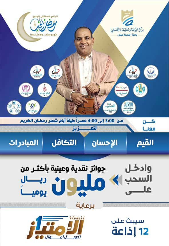 برعاية شبكة الامتياز للحوالات المالية على مستوى اليمن البرنامج الرمضاني الرئع « رمضان الخير »الذي يقدمه الإعلامي المتألقمحمد المحمدي الذي يتمتع بقاعدة جماهيرية عريضة داخل الوطن وخارجه كان ومازال حاضر في