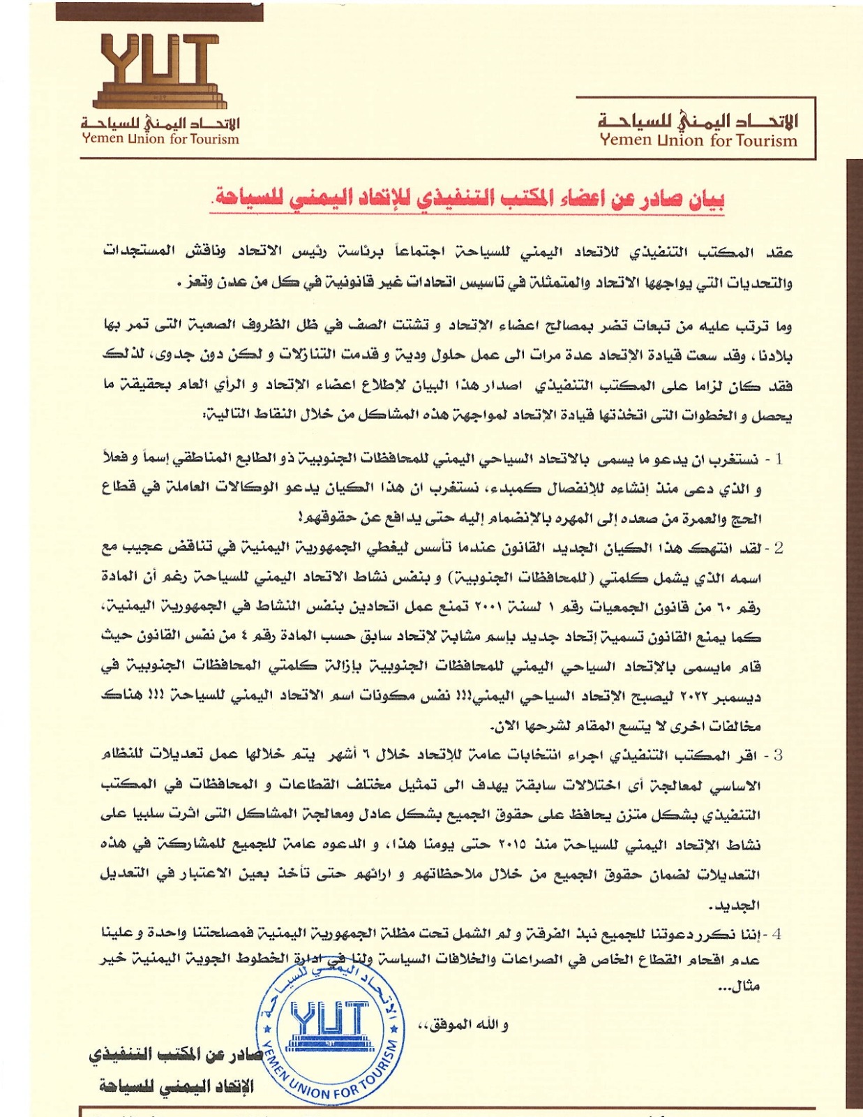 عقد المكتب التنفيذي للإتحاد اليمني للسياحة اجتماعاً برئاسة رئيس الإتحاد حسين الصباحي تم مناقشة المستجدات والتحديات التي يواجهها الإتحاد والمتمثلة في إنتحال بعض الجهات في عدن وتعز الصفة الرسمية للإتحاد ..ولفت