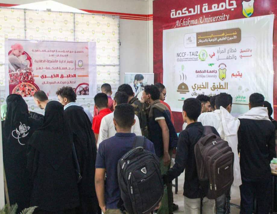 بالتزامن مع اليوم العالمي للسرطان، أقامت إدارة الأنشطة بجامعة الحكمة فرع تعز، اليوم، الطبق الخيري لصالح مرضى السرطان، وذلك بالتنسيق مع المؤسسة الوطنية لمكافحة السرطان.وقد شــارك في هذه الفعالية العديد من