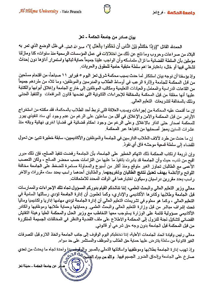 أغلق مسلحين مبنى جامعة الحكمة بمدينة تعز، بتوجيهات قضائية على خلفية رفض الجامعة تعديل نتائج اثنين من الطلاب الراسبين.وأصدرت جامعة الحكمة بتعز بيانا استنكرت فيه اقتحام مسلحين تابعين لمحكمة شرق تعز، مبنى الجامعة