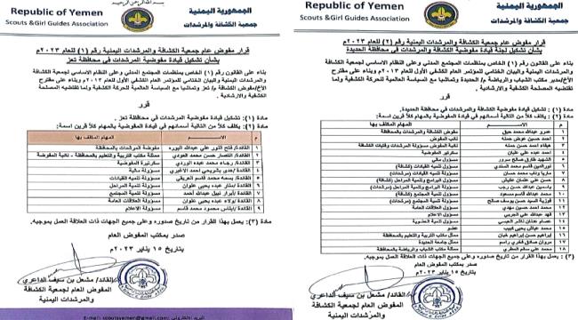 اصدر مفوض عام جمعية الكشافة والمرشدات اليمنية القائد الكشفي مشعل الداعري قرار رقم (۱) للعام ٢٠٢٣م بشأن تشکیل قيادة مفوضية المرشدات في محافظة تعز.ونص