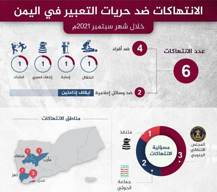 أصدر مرصد الحريات الاعلامية في اليمن تقريرة الشهري ” انفوجرافيك ” حول وضع الحريات الاعلامية ومايتعرض لة الصحفيين والمؤسسات الإعلامية من ممارسات تعسفية .