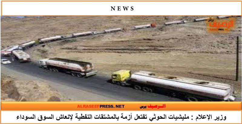 أكد وزير الإعلام في الحكومة الشرعية ، معمر الارياني ،أن استمرار مليشيات الحوثي الانقلابية في احتجاز عشرات القاطرات المحملة بالمشتقات النفطية يأتي بهدف افتعال أزمة وانعاش السوق السوداء .
