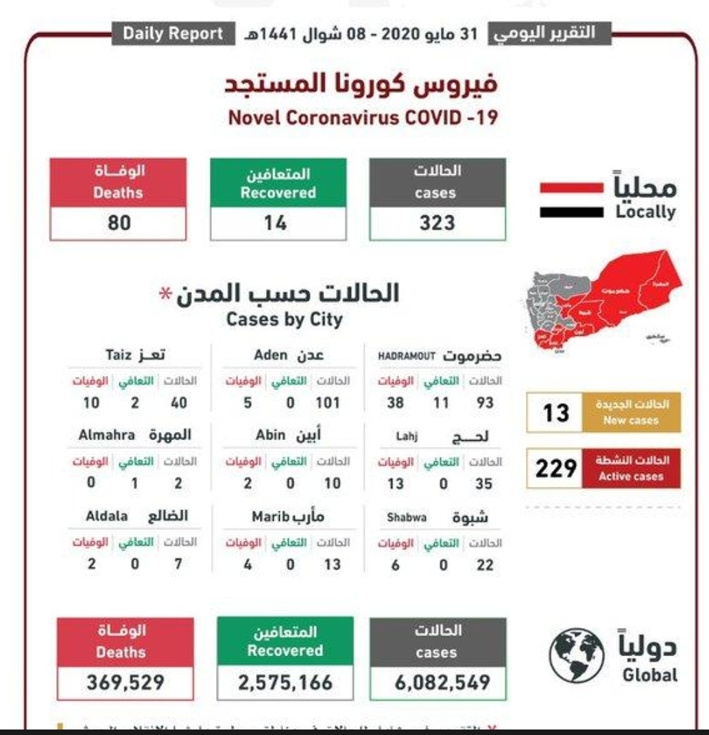 سجلت وزارة الصحة التابعة للحكومة الشرعية ( 13 ) حالة إصابة جديدة مؤكدة بفيروس كورونا ، خلال الساعات الأخيرة من يوم أمس الأحد . حيث نشرت احصائية على حسابها في " تويتر " وضحت فيها اجمالي عدد الحالات في المحافظات الخاضة