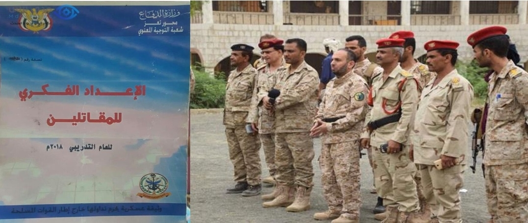 تستمر مهمَّة استعراض الكتاب الصَّادر عن شعبة التوجيه المعنوي بمحور تعز والمعنون بـ”الإعداد الفكري للمقاتلين للعام التدريبي 2018”، في فضح محتويات الكتاب، التي تعد بمثابة غسيل لعقول أفراد الجيش وتفخيخها