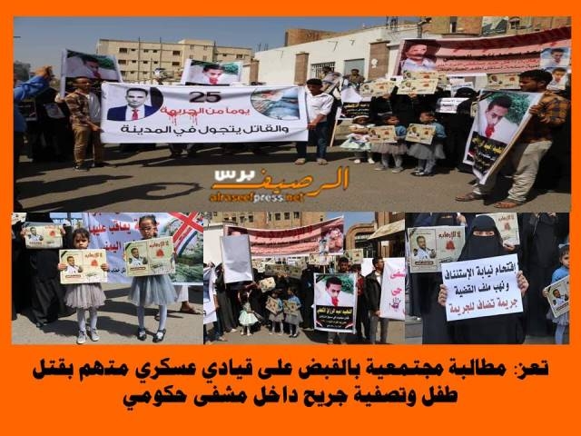 نظم العشرات من أهالي شرعب الرونة والأكاحلة، صباح اليوم، وقفة احتجاجية للمطالبة بالقبض على قيادي عسكري، متهم بقتل طفل وتصفية جريح داخل مشفى حكومي، بمدينة تعز .