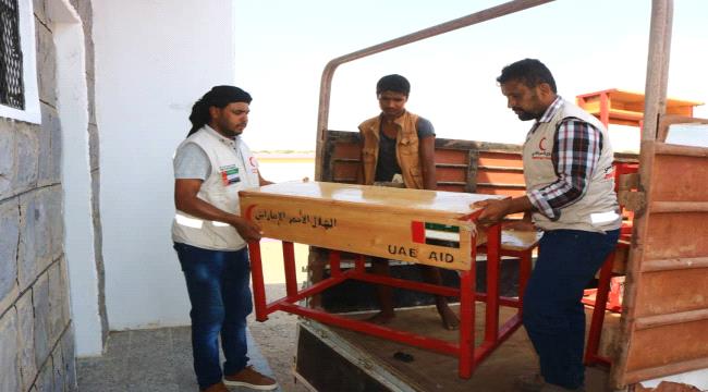 تواصل دولة الإمارات العربية المتحدة عبر ذراعها الإنسانية، هيئة الهلال الأحمر ، توزيع الكراسي المزدوجة لمدارس الساحل الغربي ضمن خطتها