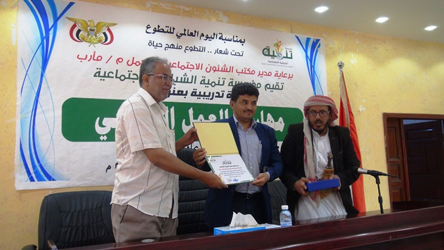 سلم المدير التنفيذي لمؤسسة تنمية الشبابية الاجتماعية أ / حميد مطهر اليوم الأحد 8 / 12 /2019 م درع المؤسسة لمدير عام مكتب الشئون الاجتماعية والعمل محافظة مأرب وذلك خلال تدشينه للدورة التدريبية الخاصة بمهارات
