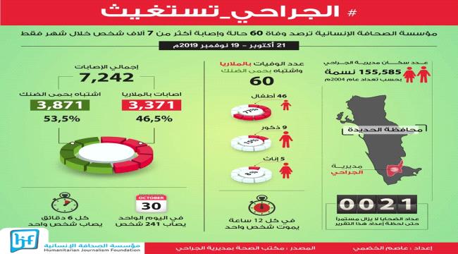 رصدت مؤسسة الصحافة الإنسانية HJF وفاة 60 حالة ، وإصابة أكثر من 7 آلاف حالة بالملاريا وحمى الضنك في مديرية الجراحي بمحافظة الحديدة الساحلية أغلبهم من الأطفال
