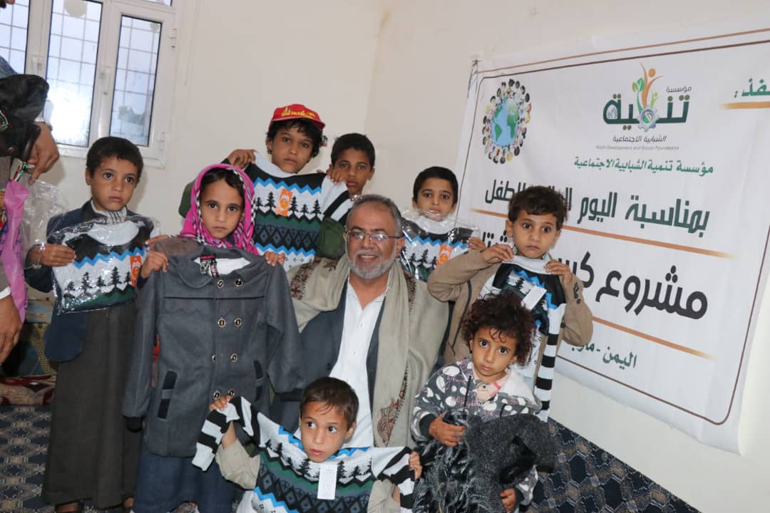 (بمناسبة اليوم العالمي للطفل) مؤسسة تنمية توزع كسوة الشتاء ل١٠٠ طفلنفذت مؤسسة تنمية الشبابية الإجتماعية اليوم الخميس مشروع توزيع كسوة الشتاء للاطفال بمأرب .واستهدف المشروع ١٠٠ طفل وطفله من الايتام واطفال الاسر