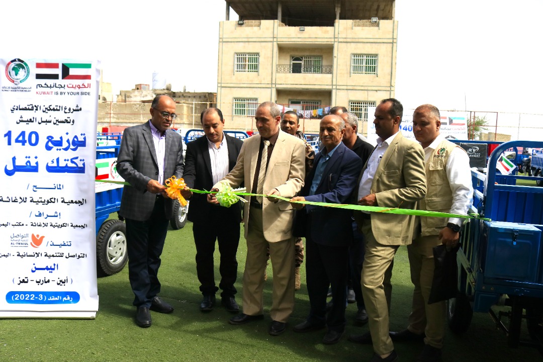برعاية محافظ محافظة تعز الأستاذ / نبيل شمسان دشنت التواصل للتنمية الإنسانية صباح اليوم بمحافظة تعز مشروع التمكين الاقتصادي وسبل العيش بتوزيع 140 تكتك نقل بتمويل من الجمعية الكويتية للإغاثة - دولة الكويت وتنفيذ