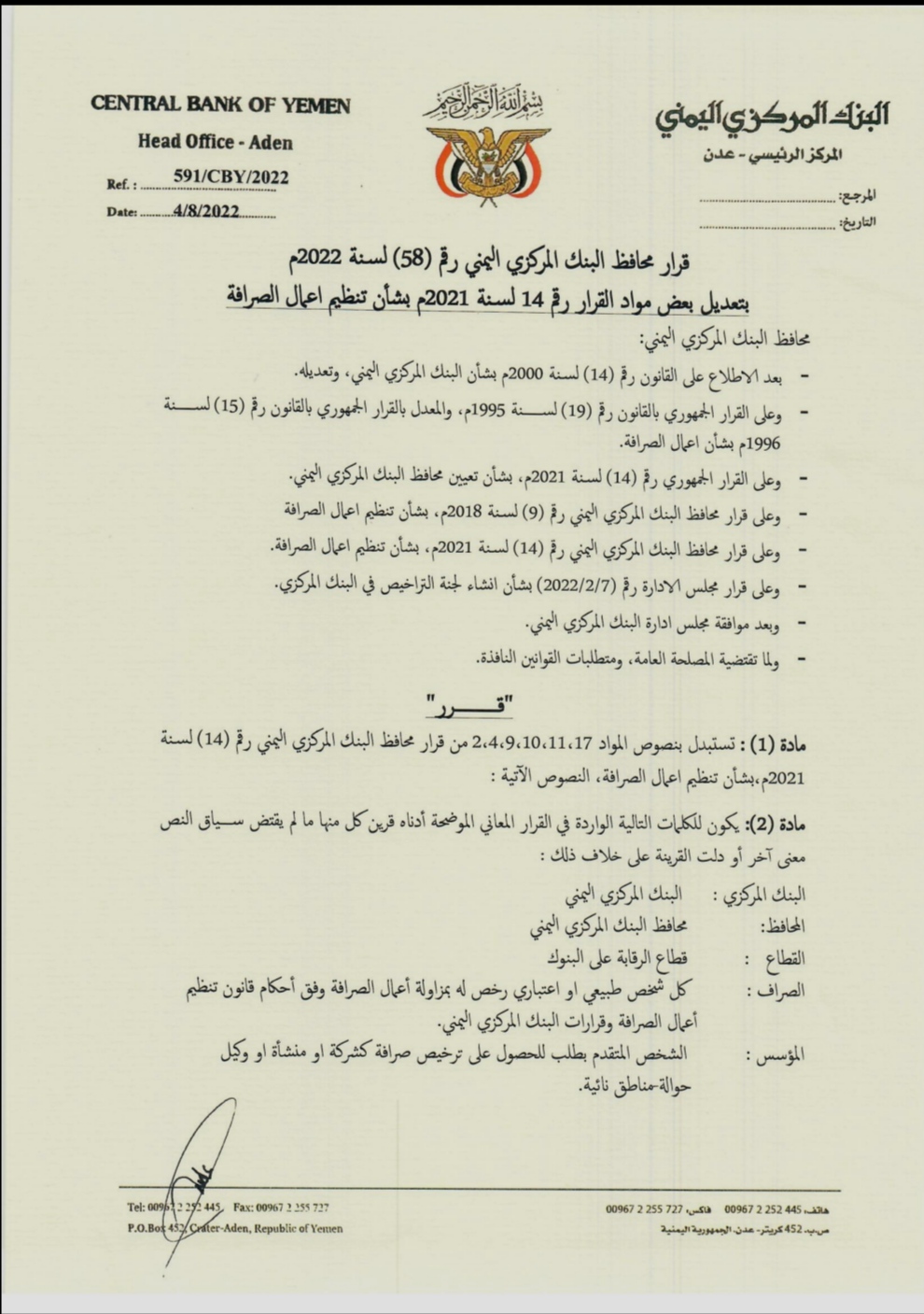 أصدر محافظ البنك المركزي قرار رقم (58) لسنة 2022م، بشأن تنظيم أعمال الصرافة.