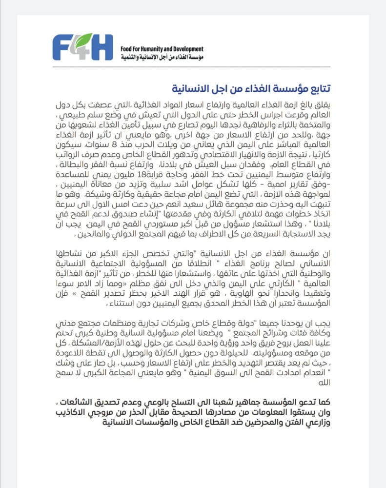 خاص/ حذرت مؤسسة الغذاء من اجل الانسانية من تأثير ازمة الغذاء العالمية على اليمن الذي يعاني من ويلات الحرب منذ 8 سنوات، وقالت المؤسسة ان الازمة العالمية عصفت بكل دول العالم وقرعت اجراس الخطر حتى على الدول الغنية