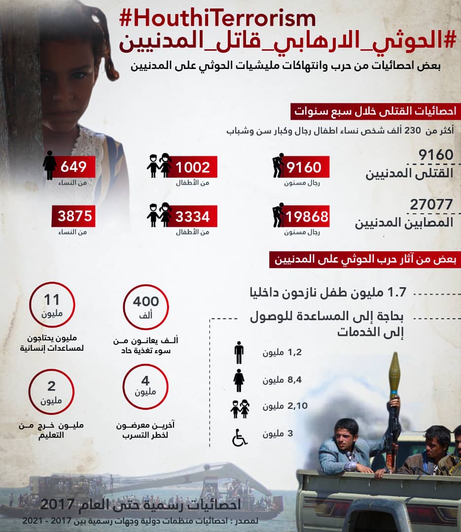 المدنيون في اليمن ضحايا مليشيا الحوثي الإرهابية بالاستهداف العشوائي والألغام والحصار
