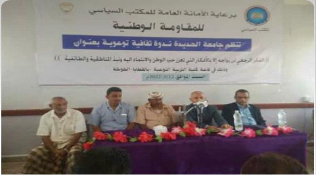 برعاية سياسي المقاومة الوطنية.. جامعة الحديدة تُنظم ندوة ثقافية لإرساء مفاهيم الوطنية