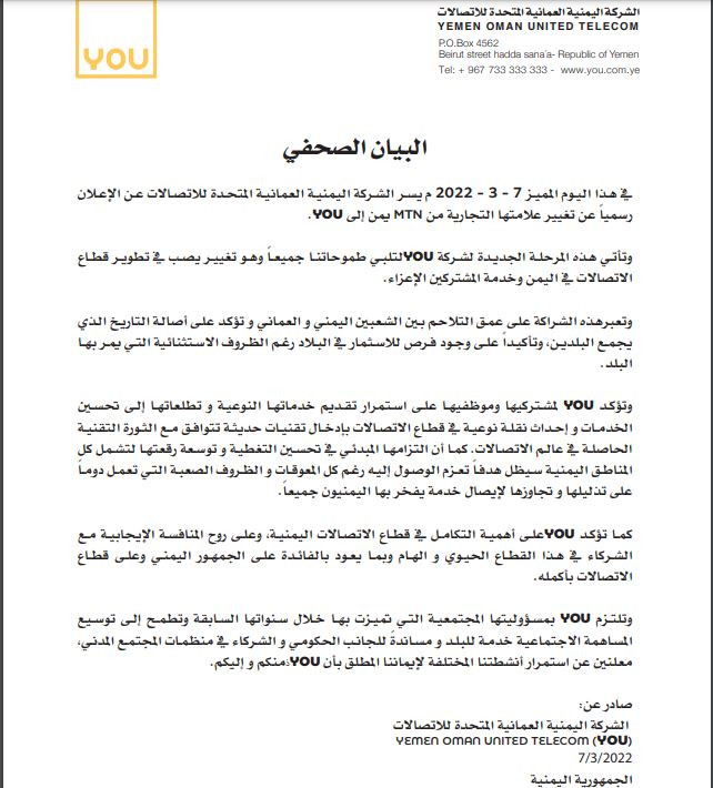 دشنت الشركة اليمنية العمانية المتحدة للإتصالات اليوم إطلاق العلامة التجارية YOUtelecome والعمل تحت اسم YOU بشكل رسمي بديلاً عن أسم MTN.وأكد الدكتور عبدالله بن زهران البلوشي رئيس مجلس إدارة شركة.YOU Yemen Oman United للاتصالات خلال