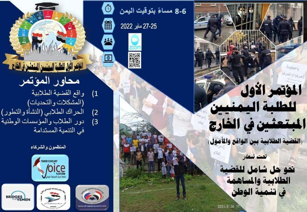 بعد عقد اجتماعيات وورش وندوات وفعاليات حقوقية وتوعوية لقرابة العام تقوم منصة صوت المبتعث اليمني بالتعاون مع رابطة موفدي الجامعات اليمنية وإتحاد الطلاب اليمنيين الدارسين في روسيا وجسور من أجل اليمن بعقد المؤتمر