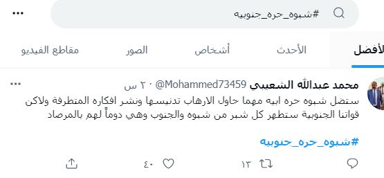 أطلق نشطاء ومغردون محليون، هاشتاج على مواقع التواصل الإجتماعي، بوسم "#شبوه_حره_جنوبيه" بالتزامن مع تحرير مديرية عسيلان في إطار عملية عسكرية واسعة لتحرير مديريات بيحان غرب شبوة أطلق عليها عملية "الرمال