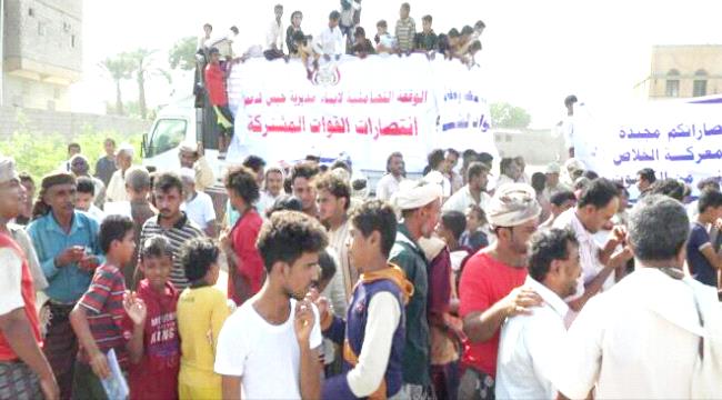نفذ أبناء مديرية حيس جنوب محافظة الحديدة، اليوم الاثنين، وقفة جماهيرية، للتعبير عن فرحهم بتحرير القوات المشتركة مديريتهم وتطهيرها من