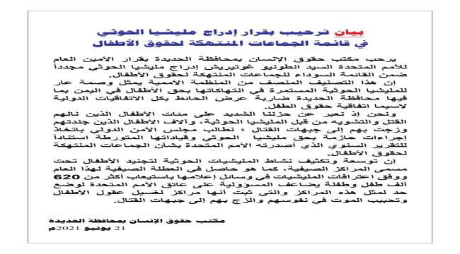 رحب مكتب حقوق الإنسان بمحافظة الحديدة بقرار الأمين العام للأمم المتحدة السيد انطونيو غوتيريش إدراج مليشيا الحوثي مجدداً ضمن القائمة
