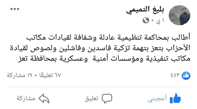 طالب رئيس الهيئة التنفيذية للمجلس الثوري بمحافظة تعز، بليغ التميمي، بمحاكمة قيادات فروع الأحزاب السياسية على خلفية قيامها بتزكية شخصيات