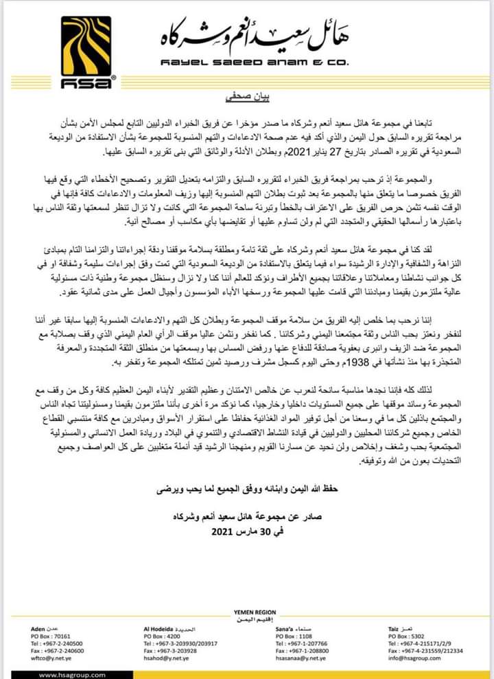 يمن اونلاينرحبت مجموعة شركات هائل سعيد أنعم بمراجعة فريق الخبراء لتقرير السابق والتزامه بتعديل التقرير وتصحيح الأخطاء التي وقع فيها الفريق خصوصا مايتعلق بالمجموعة، مثمنة حرص الفريق على الاعتراف بالخطأ وتبرئة