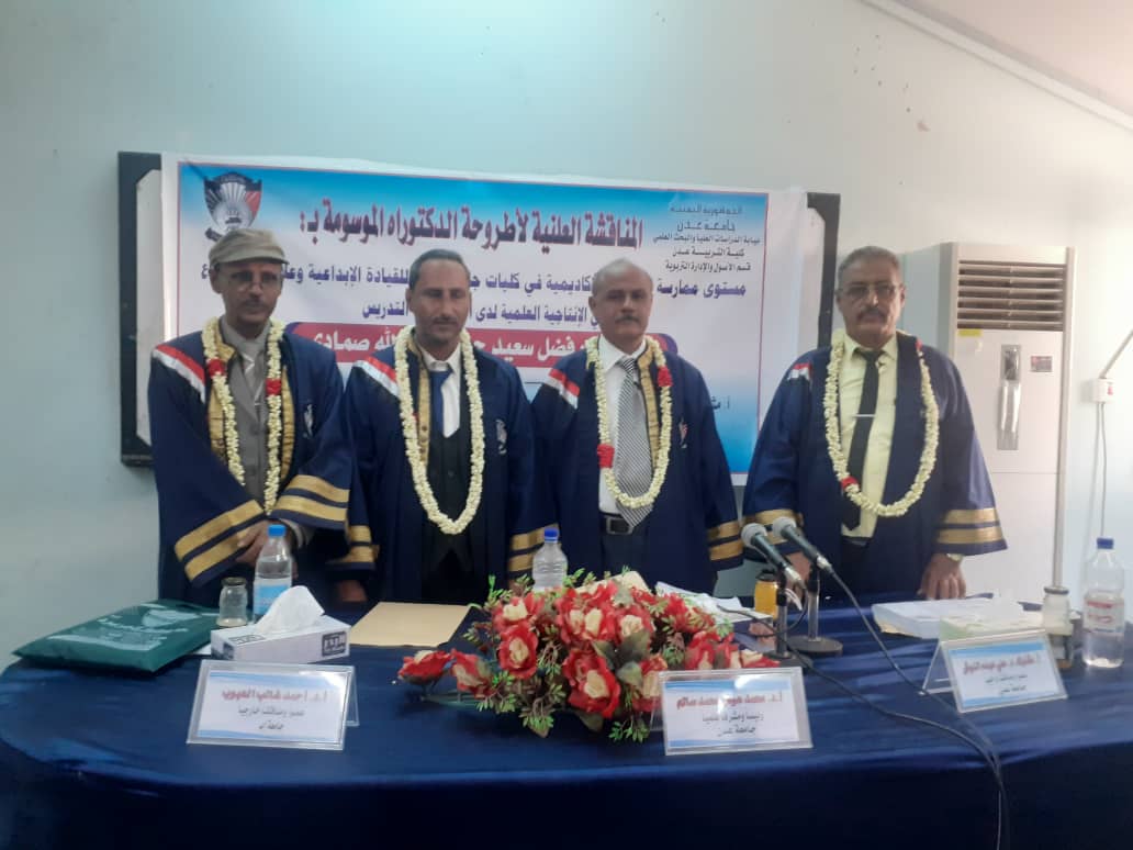 منحت جامعة عدن صباح اليوم الثلاثاء في كلية التربية درجة الدكتوره للباحث فضل سعيد حمود عبدالله صمادي على اطروحته الموسومة ب مستوى ممارسة القيادات الأكاديمة في كليات جامعة عدن للقيادة الإبداعية وعلاقتها بالإبداع