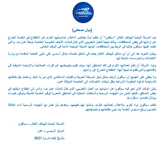 سبافون- خاصقالت شركة شبافون للهاتف النقال في مناطق سيطرة الشرعية انها تعتذر لمشتركيها نتيجة انقطاع الخدمات في بعض المناطق وواضحت الأسباب ووصفتها بالاعتداءت التخريبية على شبكة عدن نت ، واوضحت ايضاً أن طاقم عدن