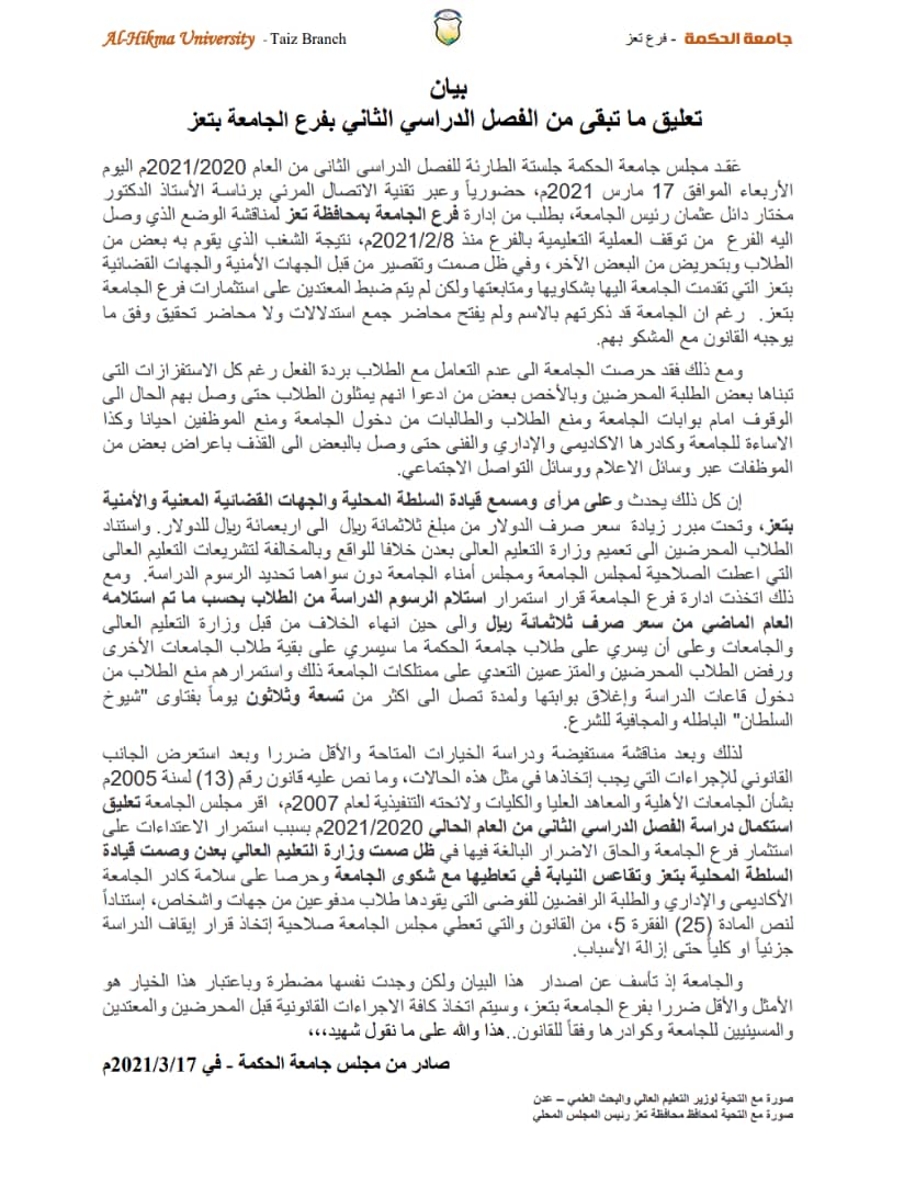 «مجلس جامعة الحكمة - تعز» يعلن تعليق استكمال الفصل الدراسي الثاني2020/2021م بسبب استمرار الاعتداءات على استثمارات الجامعة ويحمل الجهات الحكومية المسؤولية (بيان)