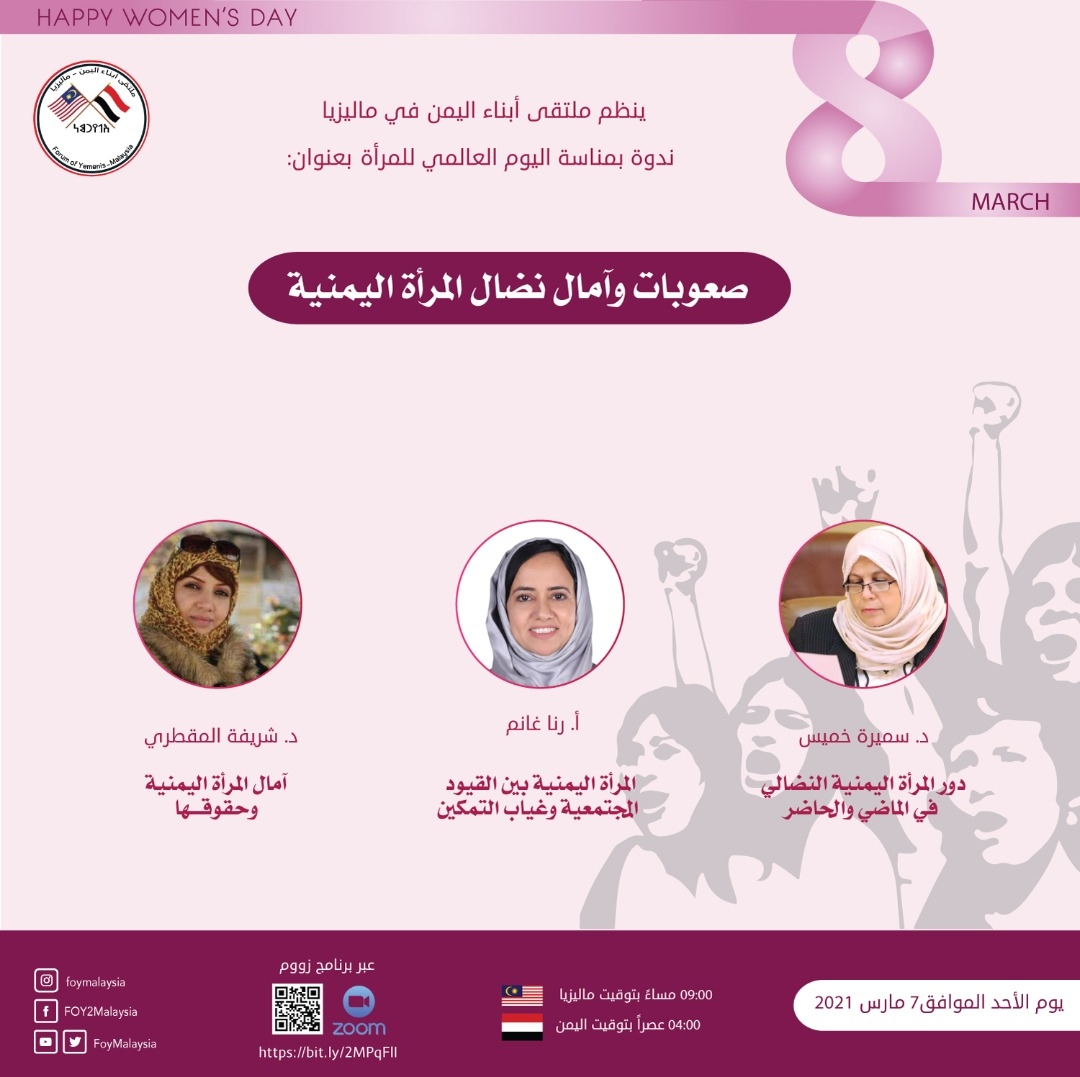 نظم ملتقى أبناء اليمن في ماليزيا عبر برنامج الزوم، اليوم الاحد، ندوة بمناسبة اليوم العالمي للمرأة الذي يصادف 8 مارس من كل عام وكانت بعنوان "صعوبات وآمال نضال المرأة اليمنية".