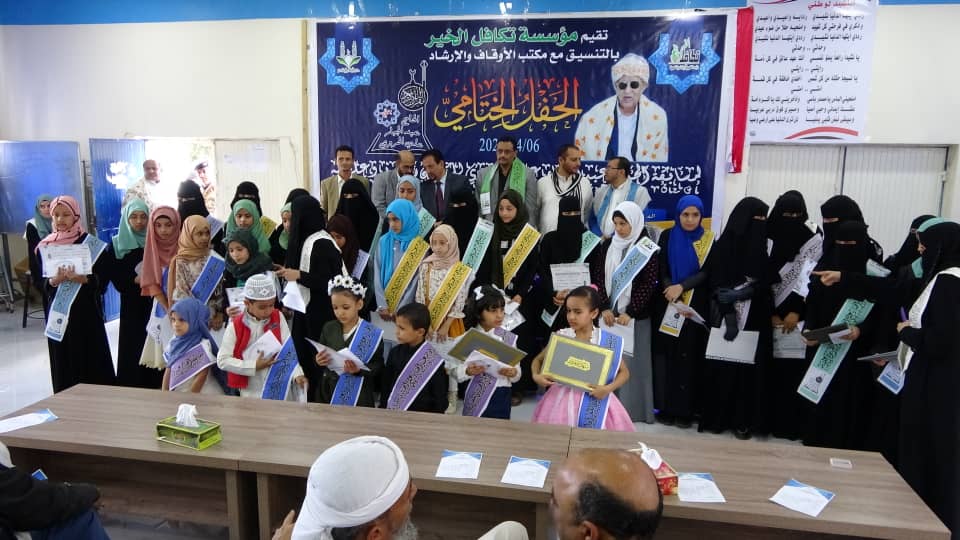 تعز احتفل في محافظة تعز بتكريم متسابقي القران الكريم في حفل ختامي لمسابقة الحاج عبدالجبار على الحروي للقران الكريم وعلومة والذي تقيمة لدورتها الثالثه مؤسسة تكافل الخير بالتنيسق مع مكتب الاوقاف والارشاد بتعز