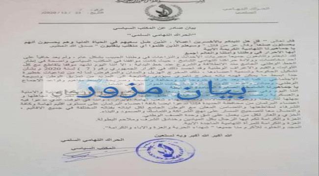 نفى الحراك التهامي السلمي اليوم الخميس، علاقته ببيان مزور تناقلته بعض المواقع الاخبارية بشأن تشكيل الحكومة اليمنية جديدة.