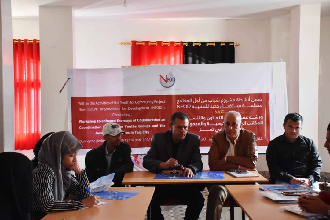 يمن اونلايندشنت منظمة مستقبل جديد للتنمية NFOD ورشة عمل لتعزيز آلية التعاون والتنسيق بين المكاتب الخدمية الحكومية والمجموعات الشبابية في مدينة تعز، ضمن أنشطة مشروع شباب من أجل المجتمع بحضور كلا من مدير عام
