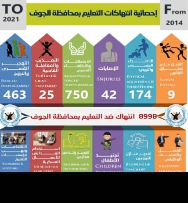 كشف تقرير رصدته لجنة الحقوق والإعلام في محافظة الجوف 8 آلاف و998 انتهاكاً، بحق التعليم في المحافظة خلال الفترة من سبتمبر 2014م وحتى مارس 2021م.