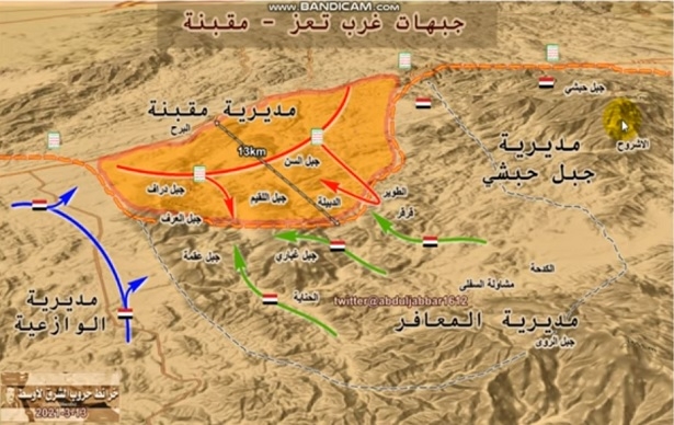 أحرزت قوات الجيش الوطني اليوم السبت تقدمات جديدة، في جبهة مقبنة، غربي محافظة تعز، باتجاه منطقة البرح والخط الرابط بين تعز والحديدة.