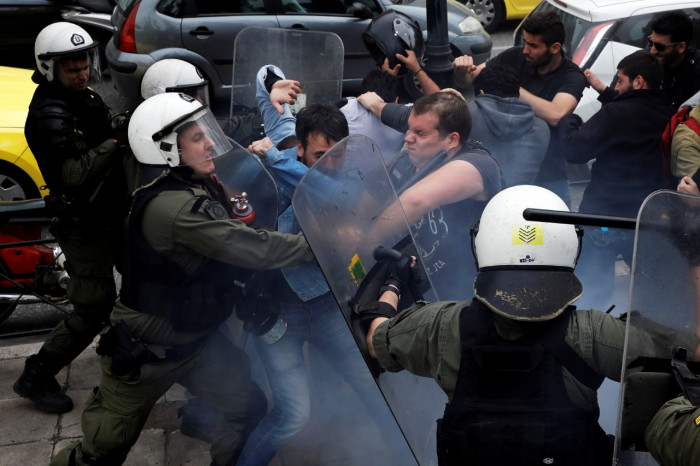أعلنت الشرطة اليونانية عن إصابة 3 ضباط من عناصرها، خلال مظاهرة خرج فيها حوالي 5000 شخص، بمنطقة جنوب غرب وسط أثينا.وأكدت أنه تم إلقاء القبض على مئات الشبان القنابل الحارقة والحجارة على رجال الشرطة الذين