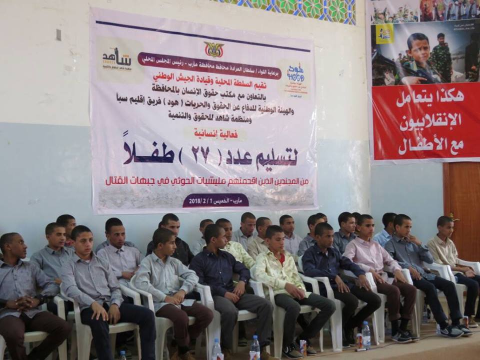 أعلنت السلطة المحلية بمحافظة مارب صباح اليوم الخميس اليوم إطلاق سراح 27 من الأسرى الأطفال المغرر بهم من قبل مليشيا الحوثي وصالح الانقلابية، تتراوح أعمارهم بين الــ 12 و 15 عاماً، تم أسرهم من جبهات القتال.جاء ذلك خلال